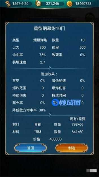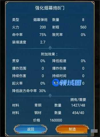 其实这里非常推荐“强化烟幕炮”,射程有560,高于一般的烟幕炮,搭配一般射程600的炮很好,比那些500给力,当然了,火力差一些。已知的图纸有“强化烟幕炮8门”,海盗掉落图纸,马赛制造。不过我一般用的是“强化烟幕炮4门”这玩意儿没得造,只能海盗掉。