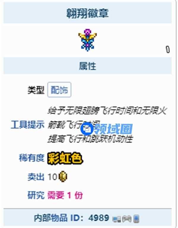 翱翔徽章不是一个翅膀类的饰品,本身也没有飞行能力。玩家同时必须装备翅膀或火箭靴才能获取其无限飞行时间的加成。