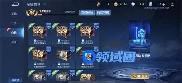 战令兑换商店,使用战令币,每10战令币购买一个宝箱,开启宝箱一定概率获得皮肤,宝箱只有购买进阶战令玩家并且达到战令50级才可以购买。