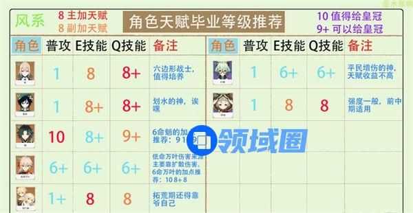 风系角色更多的是利用到里风套圣遗物的强力减抗效果,作为增删辅助的存在。魈和万叶在满命之后,天赋加点的优先级会有所变化。风主为前中期开荒时用,后期出场机会较少,所以天赋等级没必要升太高。