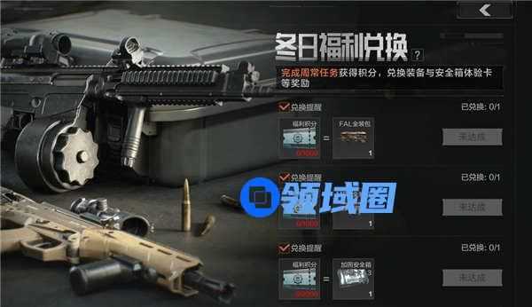 冬日福利兑换活动的奖励只需要完成周常任务就可以通过获得福利积分兑换相应奖励,积分足够可以兑换全装包,更有机会兑换到1*2安全箱体验卡等物资奖励,对于需要冲刺赛季段位的先锋来说MDR和FAL全装包,可以更好保证自己起装备去冲击暗区传说!