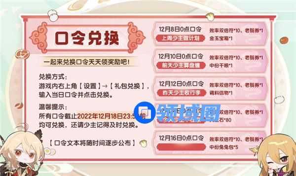“今天——少主不在家的第一天,这次要去多久才会回来呢……”“我,我才没有开始想那家伙呢!”(●´ω`●) 今日口令今天少主不在家 兑换方式:游戏内右上角【设置】→【礼包兑换】,输入口令并点击兑换。温馨提示:管理司将于12月8日至12月16日隔天奉上1个预热福利口令,截止12月18日23:59,还请少主及时兑换~
