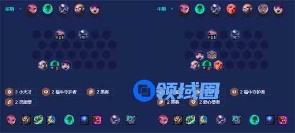 前期用三小天才+拉克丝过渡,五人口可以补护卫,如果有娑娜或者地下魔盗团来得早也可以用魔盗团过渡,中期搜到二星娑娜和二星阿利斯塔后稳血上人口补五费卡即可
