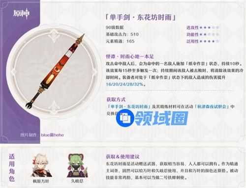 东花坊时雨是510白值的单手剑,白值与词条量皆为中等,主词条为元素精通,所以可以装备给枫原万叶、久岐忍这样的精通为有效词条的单手剑角色。基本可以当做二号铁蜂刺看待。