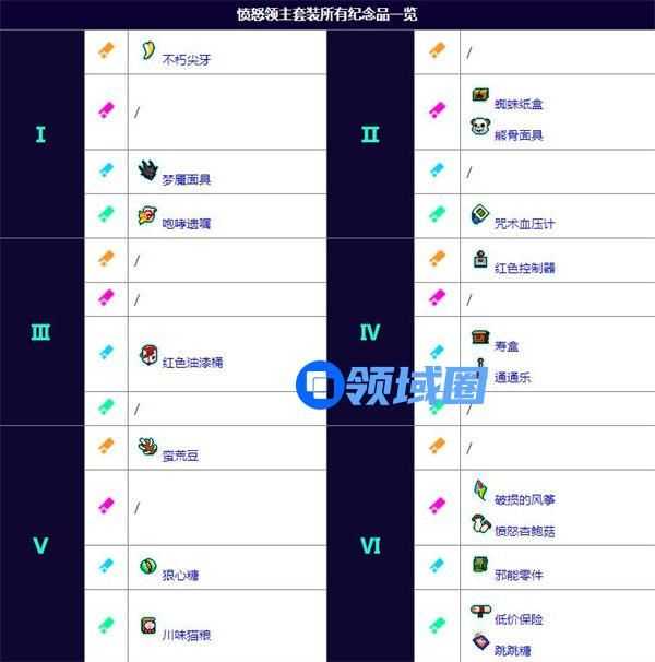 2、下面是除了愤怒领主套装之外,能对愤怒精灵造成影响的所有纪念品,我们为大家做了一个汇总。