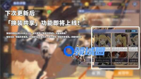 某角色好感度达到100及以上时,即可使用「换装共享角色」的普通换装。