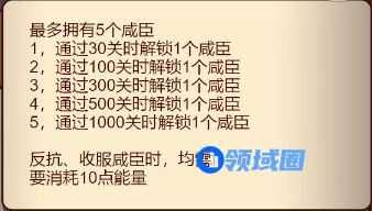 咸主玩法相当于就是去抓玩家进行奴役制度,最多可以拥有5个咸臣,通过固定的关卡之后会增加咸臣的数量,下面是写的有的反正通过了1000关之后就可以征服5个好友来当咸主了,每次都会消耗10点的能量这个后面我们会将的。