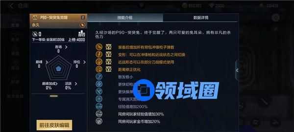 属性方面,P90-突突兔觉醒拥有英雄级武器标配的经验值和金币加成,装备后还可以为所有背包里的冲锋枪增加7发子弹。当然有条件的CFer也可以多带几款英雄级冲锋枪,这样就能大幅提升P90-突突兔觉醒的续航能力。