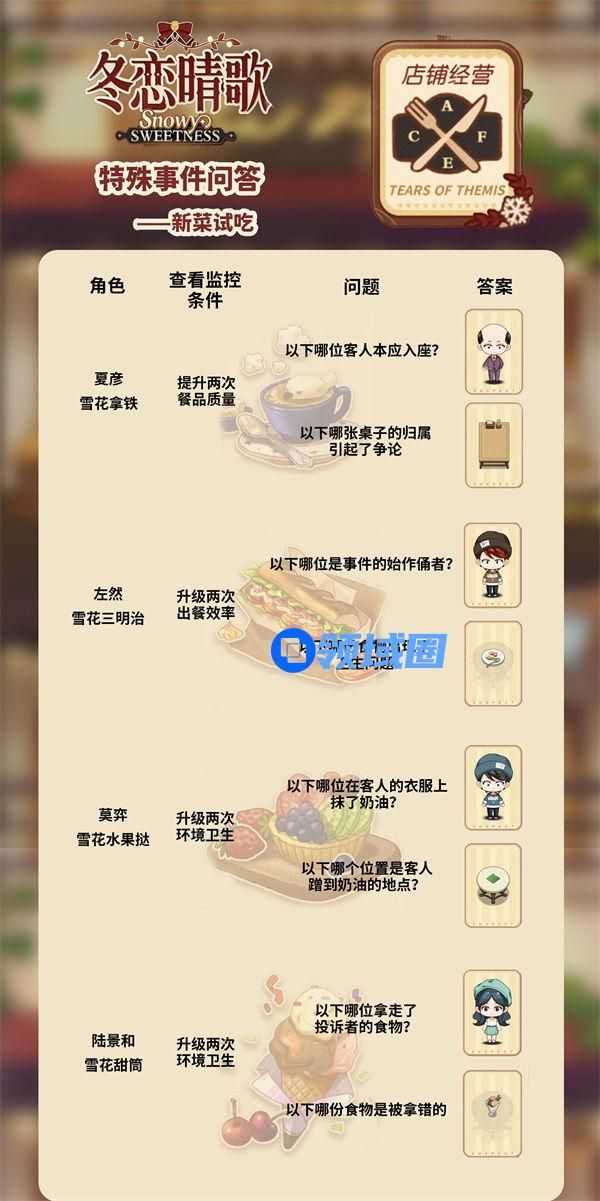 在未定事件簿的世界中,每个女性玩家不仅能体验到甜甜的恋爱剧情,还有各种推理玩法供尝试,在玩法方面最大程度满足每个女性玩家的游戏体验,男性角色的立绘都非常讲究,做到了极致,充满了霸道总裁的感觉,符合每个女性玩家的喜好。游戏中最新的冬恋晴歌活动玩法里玩家们可体验经营店铺的感觉,在经营过程中也不是一帆风顺的,是有特殊的事件发生,许多玩家不知道怎么处理这些特殊事件问答,选择正确的答案就可获取查看监控的资格,接下来为大家介绍一下未定事件簿冬恋晴歌特殊事件答案大全。