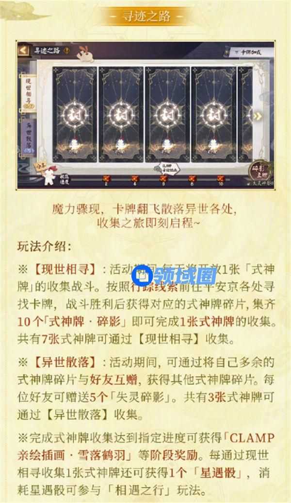 完成式神牌收集达到指定进度可获得「CLAMP亲绘插画·雪落鹤羽」等阶段奖励。每通过现世相寻收集1张式神牌还可获得1个「星遇骰」,消耗星遇骰可参与「相遇之行」玩法。