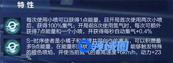 赛车特性:S-时序使者是小橘子和查理共同创作的赛车,可以积攒最多9点能量,在能量积满状态下使用氮气时,能够触发特殊的橙色喷焰,并使当前氮气的最高速度+6km/h,动力+23%。