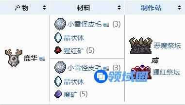 鹿华是游戏里中、后期会遇到的Boss,前提是困难模式,玩家收集齐材料就可召唤它了,看到它的身影大部分玩家就能知晓,这不是饥荒中的怪物吗,事实上是的,这是联动的产物,玩家可在泰拉瑞亚的世界中简单饥荒的怪物,想让其出现,要花很大的功夫,满足多个条件就能召唤出来了,出现的时候是暴风雪夜里,并不容易对付,召唤所需的材料都比较容易凑齐,有小雪怪皮毛、晶状体、猩红矿等,最近许多玩家不知道怎么制作,可根据下列的配方来制作,接下来为大家介绍一下泰拉瑞亚鹿华制作方法一览。