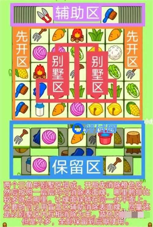 2.开局先消除橙se区的牌,这里压牌。尽量要让牌面保持在同一水平面,然后一层一层消除表面牌,不要跨层太多拿牌,等表面牌消除完后,以大别墅内互相消除为主。