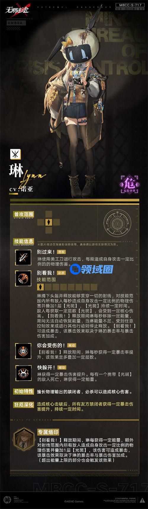 琳是游戏中即将上线的全新危级禁闭者,这次的新角色官方采用了不一样的风格设计,不同以往的成熟性感风,角色看上去更青涩年轻,她将在1月19日版本更新后上线,查看官方最新的公告就能知晓了,这次官方将会上线3名角色,还有非和黛伦,就她是危级,其他两个是狂级,可见琳应该是活动免费获得的,非、黛伦需要抽卡池,新版本中会有一个关于电影拍摄的活动,玩法内容现在还不知道,大家敬请期待吧,综合观察下来琳算是一个值得培养的角色,具体还要看实战表现,接下来为大家介绍一下无期迷途琳全方面解析。