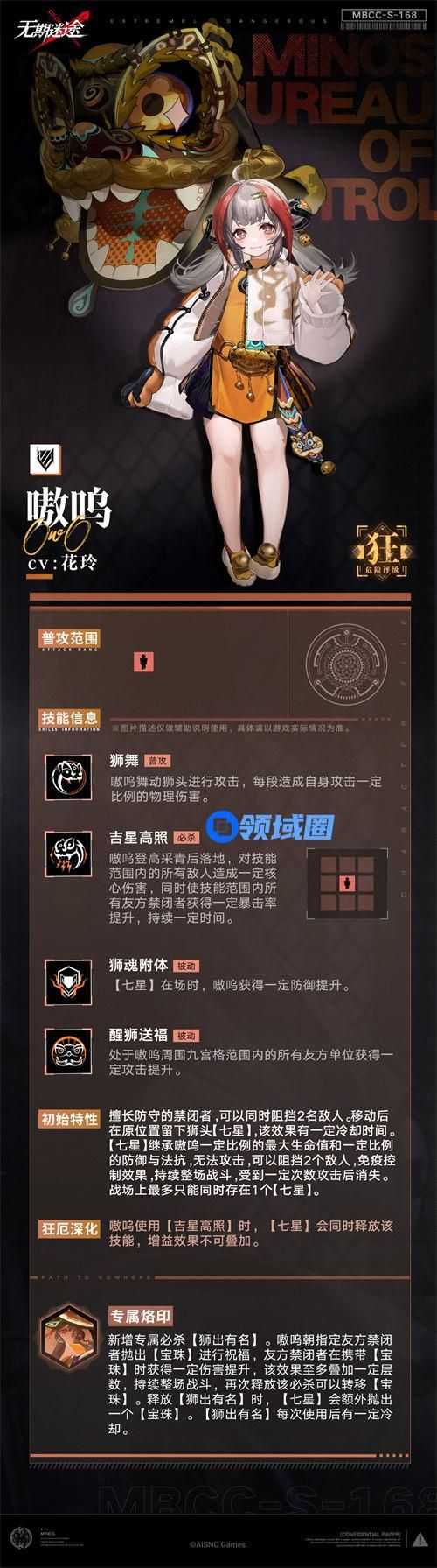 嗷呜是将在1月19日更新上线的新狂级禁闭者,技能战斗方式有明显的变化,她的定位是前排坦克,负责吸引敌人输出,能阻挡2个敌人,在其移动的时候会在场上留下一个单位,也具有阻挡2个敌人的效果,这是全新的机制,相当于她一个角色就能在一瞬间阻挡多名敌人,作到其他角色无法做到的事情,在她周围的队友,也能受到嗷呜攻击buff加成,看到这里基本都知晓嗷呜是当前环境必练的角色之一,必杀还是大范围的破核攻击,同时为范围内友方提升暴击率,接下来为大家说明一下无期迷途嗷呜技能介绍。