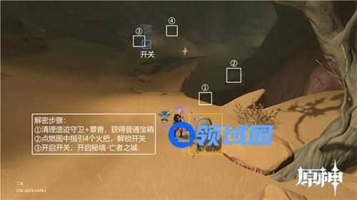 亡者之城是原神3.4版本更新后的新秘境副本,在新区域千壑之地当中,需玩家前往解开谜题才会开启,完成解谜内容也能获得丰富的原石奖励,当玩家到达下方图片的所在地时,就能看到和解谜有关的互动玩法。按照指定的步骤就能顺利的开启亡者之城的大门,过程中将会要求玩家解决一波敌人,点燃4个火把并开启装置即可,流程挺快的,能得到一个宝箱,在新版本中有不少的内容等待玩家的游玩发现,可供获取的原石也比之前版本多了不少,想抽取返场角色的玩家可积极探索,接下来为大家介绍一下原神新秘境亡者之城解锁攻略。