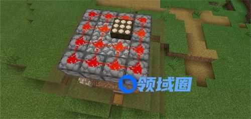 接着在它们的周围,如下图放置两个红石块和几个草方块,在中间放置四个火把(火把可以让中间的草方块不变成泥土)