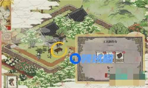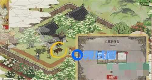 3、点击长桌制作台制作修桥工具,需要使用5木料、5铁钉、5铁矿石进行合成制作;
