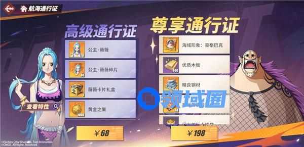 -船长们可通过完成各类任务获得「通行证经验」,从而解锁各种奖励,也可以选择购买「高级通行证」 或「尊享通行证」开启特殊奖励,尊享通行证和高级通行证需要船长分别解锁才可获取全部奖励。