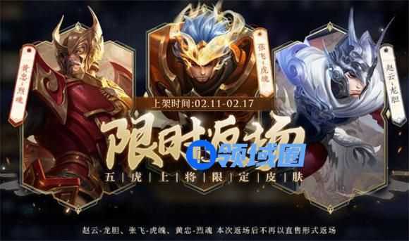 在2月11日-2月17日期间,黄忠、赵云、张飞的五虎将限定皮肤进行限时返场,每款皮肤的价格都是888点券,拥有皮肤后解锁皮肤专属个性动作。