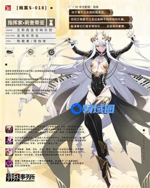 作为艾莉西亚交响乐团的首席指挥家,莉奎蒂亚是与担管理局一直敌对的存在。她管经生活的世界被称为发路健是拥有复杂声波技术体系的文明。她之所以是旧管理易的成胁,因为她是精神拓的技术的创造者,以及对这项技术无与伯比:的掌置能力。