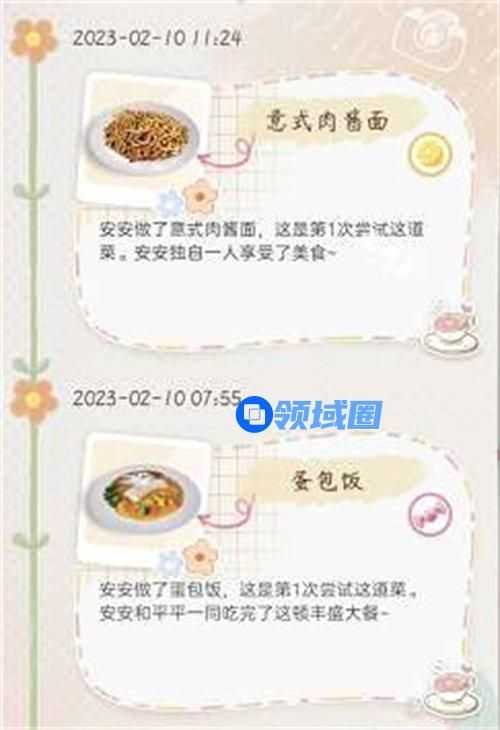 4、继续在右上角点击记录,即可查看到小偶在不同时间段做的料理,定期给小偶增加食材。