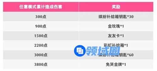 活动期间参与任意模式累计造成伤害即可获赠大量「缤纷补给箱钥匙」还有「彩虹补给箱」「金玫瑰」「友友卡」和「免哭金牌」奖励喔!