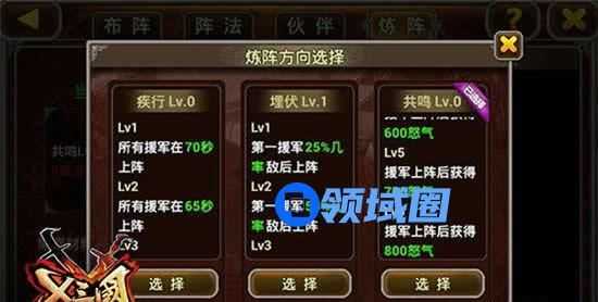 “炼阵”分为“埋伏”、“疾行”、“共鸣”三种。主公可以根据自身主将与援军的培养情况来合理配置。如果主公的前排肉盾非常强力,那么完全可以考虑选择“埋伏”,让一些强力DPS输出在敌人后方上阵,优先抢占有利阵位,可以在战斗后期实现一次完美偷袭;“疾行”更是霸道,满级的“疾行”可以让所有援军在开战40秒后就提前参战,输出为王的战场上,如果主公选择“疾行”孤注一掷,使用黄忠、司马之类的援军提前参战,那么就会在战斗中期实现极高的输出效率,很可能提前锁定胜局;“共鸣”非常适合将一些大招强悍的武将作为援军,类似马超、诸葛,上阵后立刻拥有怒气加成的话,那么就能让这些大招流武将如鱼得水,一波 爆发带走脆弱的后排绝不令人意外!
