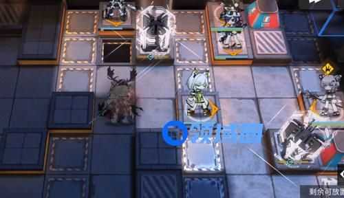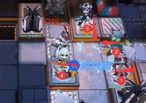 开局如下图所示:桃金娘(右)→ 先锋(左)→ 水陈(向下)→ 凯尔希(右)
