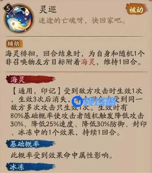 海灵是一个印记。它在被敌人攻击后生效一次,在生效三次后消失。在一轮中,同一敌人的多次攻击只生效一次。80%的基本概率使攻击者能够随机触发降低攻击、降低速度、降低防御、密封和冻结的效果,并持续一轮。