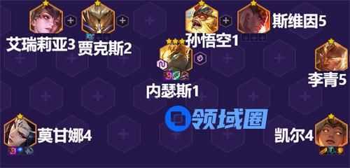 阵容组成:艾瑞莉亚、贾克斯、内瑟斯、孙悟空、斯维因、李青、莫甘娜、凯尔
