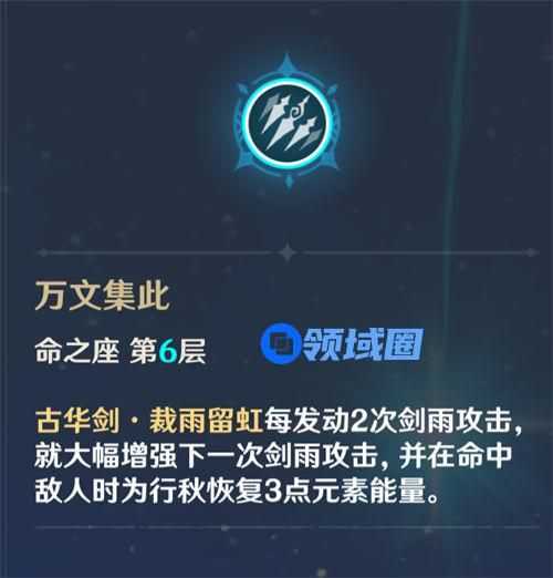 行秋6命不仅可以提升自身大招的伤害,更关键是可以给行秋回复能量,彻底解决充能问题。有了6命之后行秋可以在圣遗物中专心提升提双暴,进一步提升伤害,甚至可以携带双暴武器。行秋元素战技倍率本就不低,6命解放充能提升双暴的行秋,二踢脚能打个小核爆,真正晋升为6星水神。