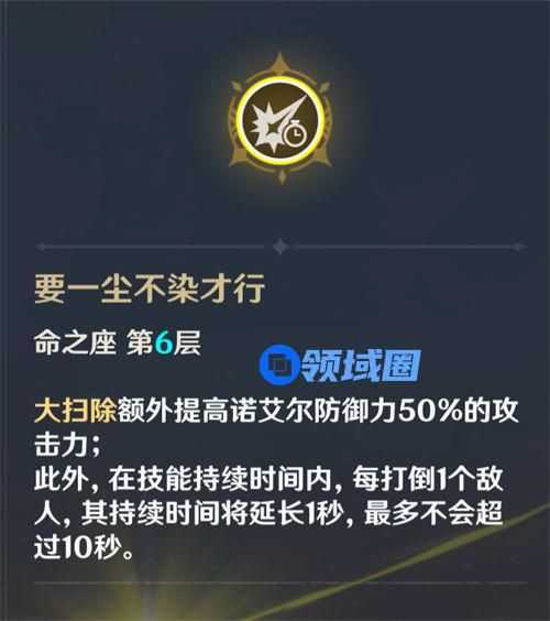 6命之前的诺艾尔,开启大招伤害也不高,并且持续时间短,难以担当主C重任。而6命诺艾尔,开大可额外获得防御值50%的攻击力,让女仆拥有站场主C的能力。并且6命诺艾尔开大每打倒1个角色,大招持续时间就延长1秒,最多10秒。6命诺艾尔真正解锁站场主C玩法,化身高达,诺艾尔真爱党必备。