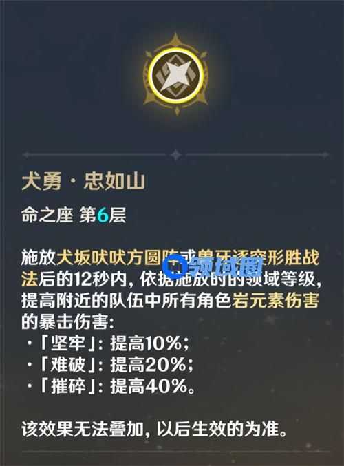 五郎是岩系专辅,满命的效果根据场上岩元素队友的数量,最多可提高40%的岩元素暴击伤害,这个效果给岩队的提升也是巨大的,能显著提升主C荒泷一斗和副C阿贝多的伤害。因此对于喜欢玩纯岩队的玩家来说,五郎的6命也是非常关键的。