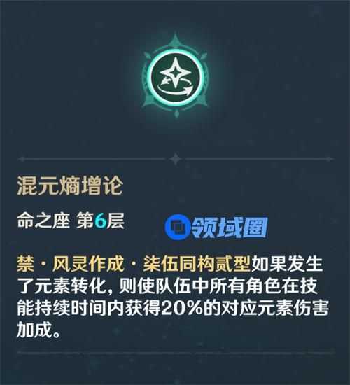 砂糖在6命之前的辅助效果,除了风套减抗外,主要是两个天赋给队友加精通,有了6命之后,队伍角色获得20%对应元素伤害加成,补上元素增伤乘区,让自己的辅助能力更加全面,因此砂糖的6命也是非常关键的。