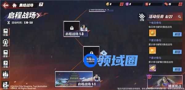 -船长可消耗门票参与活动闯关,上阵两队伙伴挑战据点关卡。通关后船长们可获取不同类型的「集结战场养成币」,养成币可用于升级伙伴在玩法内的战力以及解锁新伙伴。