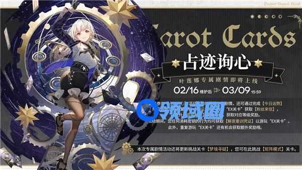 您可参与【占迹询心】活动体验叶莲娜专属剧情,还可通过完成【今日运势】阶段任务以及重复游玩【叩问之路】内的“EX关卡”获取【粉丝来信】,以提升【观星解牌】奖励等级,获取对应等级奖励。