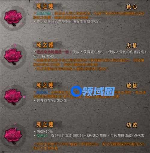 仅橙色品质:如果目标在处于死亡标记的状态下获得新的死亡标记或死亡,则会爆发出6枚死之花瓣,每枚花瓣造成X点伤害死之花瓣会对命中的敌人施加1秒的死亡标记。