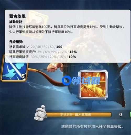 这项技能不仅会降低将军释放技能所需的愤怒,还会大大提高军队的行军速度,提高军队在野外作战时的机动性。无论是切入战局、长途攻击还是野外支援,这项技能都可以提供骑兵的需求。骑兵单位为行军速度感到自豪,超高爆发已成为这一兵种的三大特色之一,也从铁木真这一代开始。