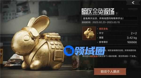 暗区金兔空投活动在开鑫好运来活动中受到了不少先锋的喜爱,所以暗区金兔将会在2月22日返场,为先锋送上幸运祝福!金兔作为本赛季的限定大金,你的个人据点和仓库里有这件限定藏品吗?