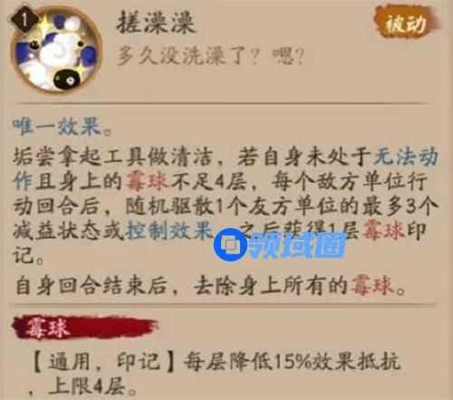 ①当霉球小于4时,敌方单位行动后,随机驱散3个朋友debuff,霉球 1