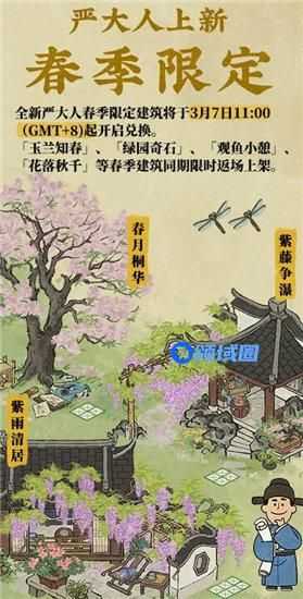 3月7日起,全新春季限定建筑【春月桐华】【紫雨清居】【紫藤争瀑】上架严大人兑换!同期【玉兰知春】【绿园奇石】【观鱼小憩】【花落秋千】等往期春季建筑将会一起返场上架!