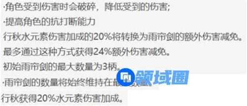 大招期间,行秋将提高抗打断能力,全程减伤,减伤比例最高为29%,理论共29% (46.6 15 20)20%=45.32%,非常可怕。雨帘剑破碎或结束,至少可以回复24%的生命值。
