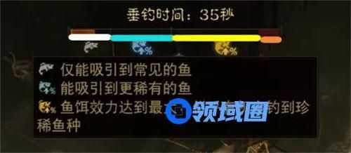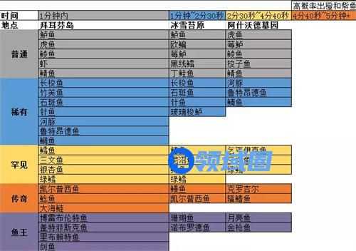 黄条:2分30秒~4分40秒保底钓到金色的鱼,有概率获得橙色或者紫色的鱼。