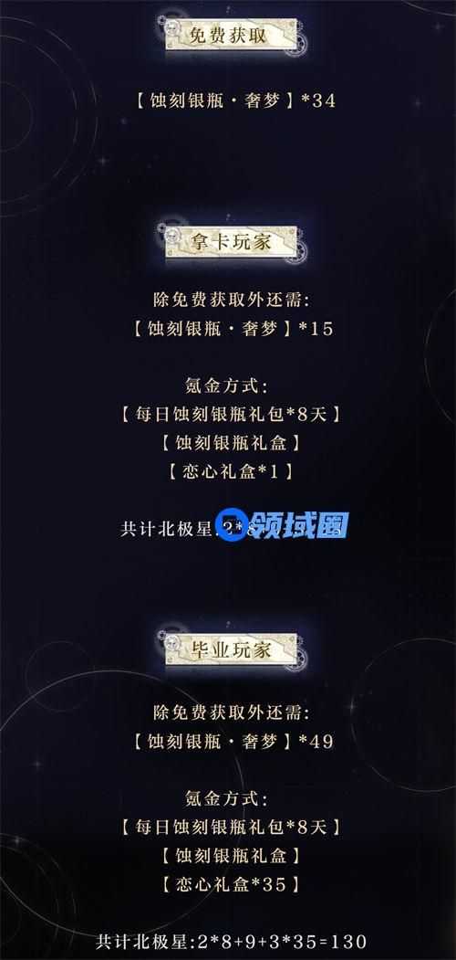 1、不想拿本次卡的设计师:完成所有限时计划即可获取全部的【共同家具】图纸,可以购买2北极星和9北极星的不限时【蚀刻银瓶】为之后的其他男主活动做准备。