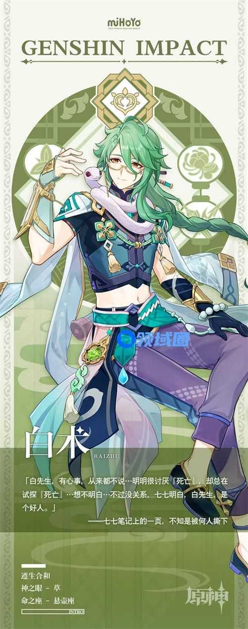 在几天官方公布了3.6版本新角色白术的消息,并上传了关于他的立绘,从外观上女性玩家估计会很喜欢,技能方面他是使用蛇来打击敌人,也可以说是放蛇咬人,技能特效到时候应该会很不错,都是围绕蛇来设计的技能,蛇的名字应该叫长生。从曝光的技能机制数据来看,白术定位是草系辅助没跑了,在队伍中时为队伍角色提供治疗、减免伤、加精通等效果,还可对敌人减草抗减防御力,功能性的效果极多,可以说随着他的上线,肯定能体验到全新的战斗玩法,阵容的搭配也会变多,接下来为大家说明一下原神3.6版本白术介绍。