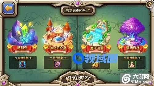 下面让我们用正确的方式来打开“错位时空”系统:这里有四种不同的副本,包括有“暗影岛”、“伽马研究室”、“魔法迷雾”以及“禁闭森林”,每种副本都以限 时击杀的方式来通关。所以玩家尽管安排战斗力最强的的英雄组合上阵,凭借优势以实力压制是通关的秘诀,有什么必杀技能就尽管使出来吧!