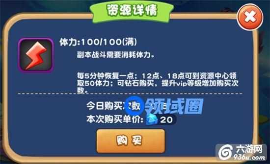 此外,亲们还可以购买体力,初始购买次数5次,随着VIP等级的提升,每日购买体力的次数也会增加,最多可购买10次。