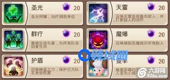 无尽圣殿为玩家提供6种附加技能,初始消耗均为20魂值,大致分为攻击类(天雷、魔爆)、治疗类(圣光、群疗)、控制增益类(变羊、护盾)