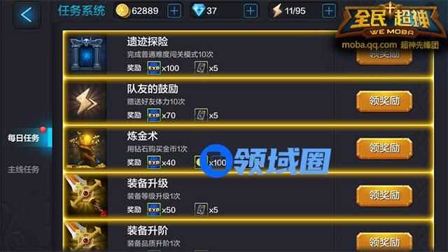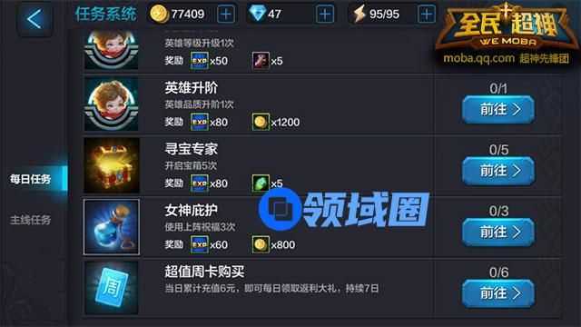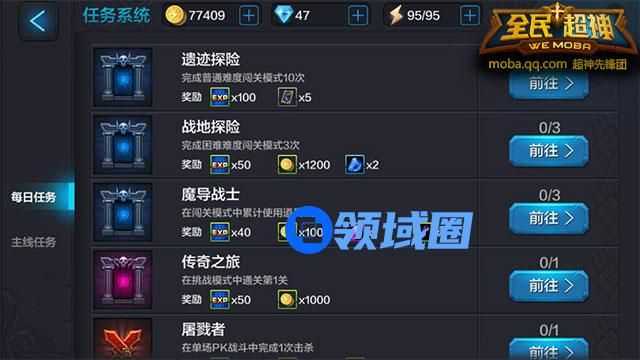 在《全民超神》中,任务系统中的主线任务完成条件相对比较苛刻,但每日任务却十分简单轻松。同时每日任务也是玩家角色成长经验值的最佳获取途径,除了超值周卡购买和每日限时体力领取任务之外,所有每日任务都会给玩家带来丰厚角色成长经验值。